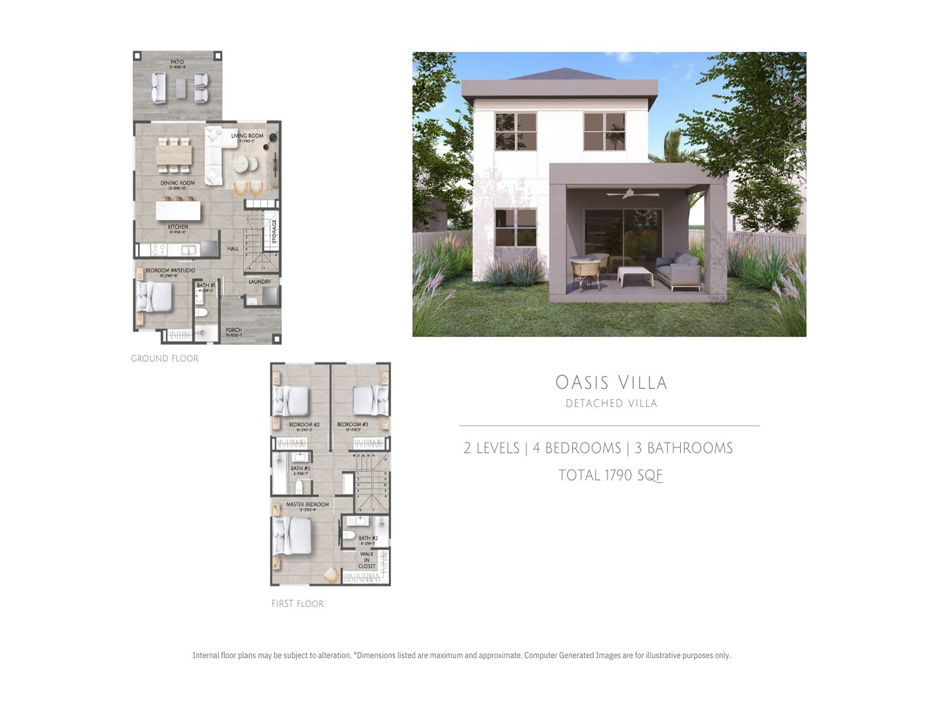 One of the available home designs is Serene, a spacious four-bedroom, two-bathroom residence featuring an open-plan layout, a fully equipped kitchen with appliances, a master suite with a walk-in closet, a large patio, a paved parking area, a fenced backyard, and a landscaped garden.